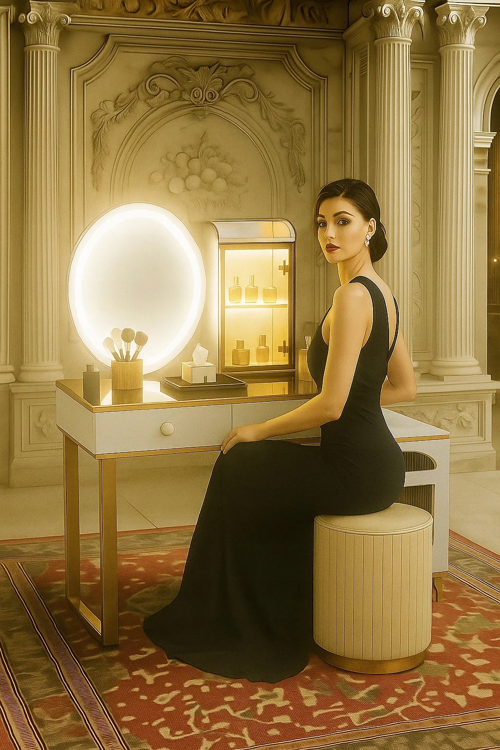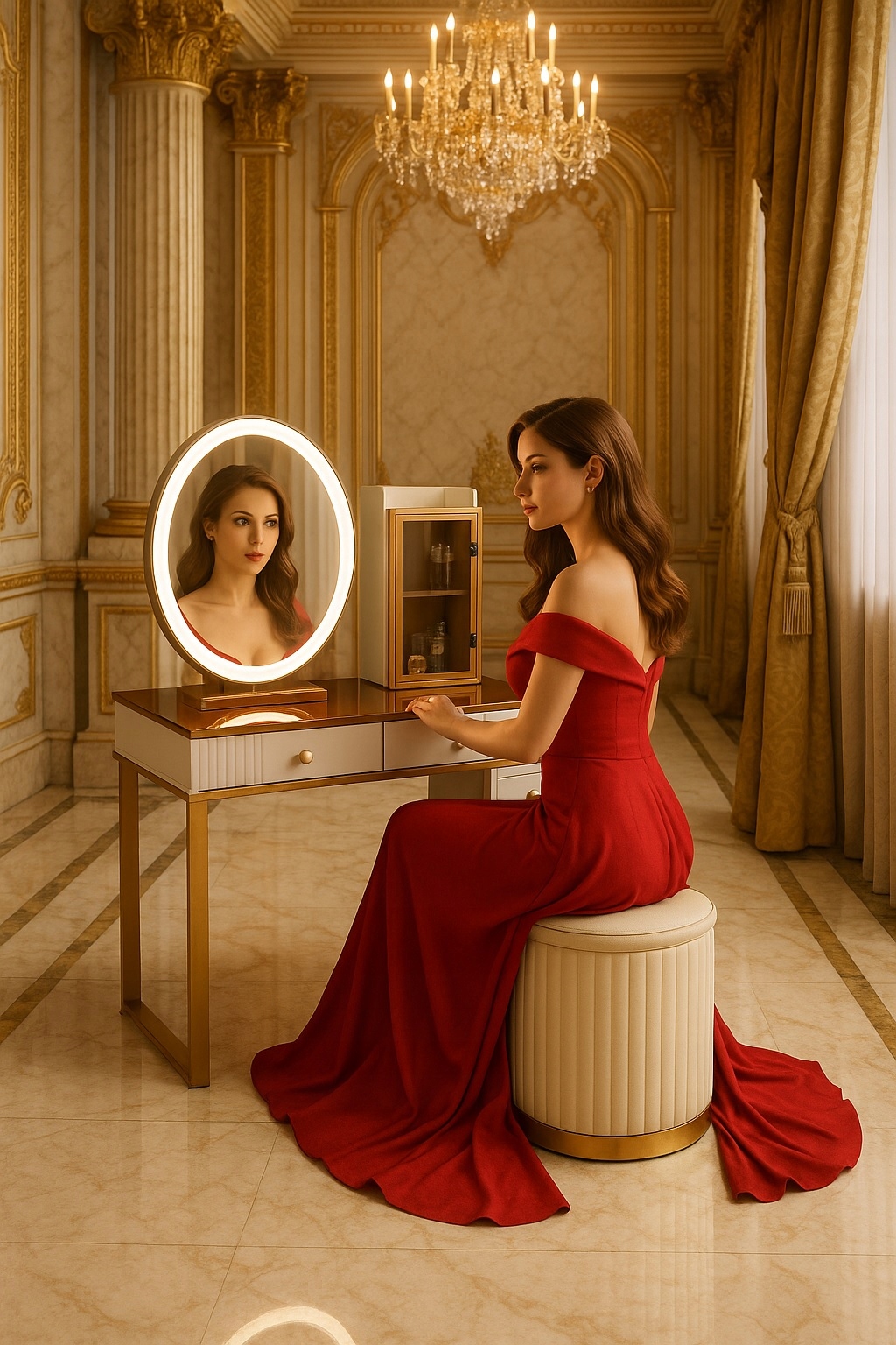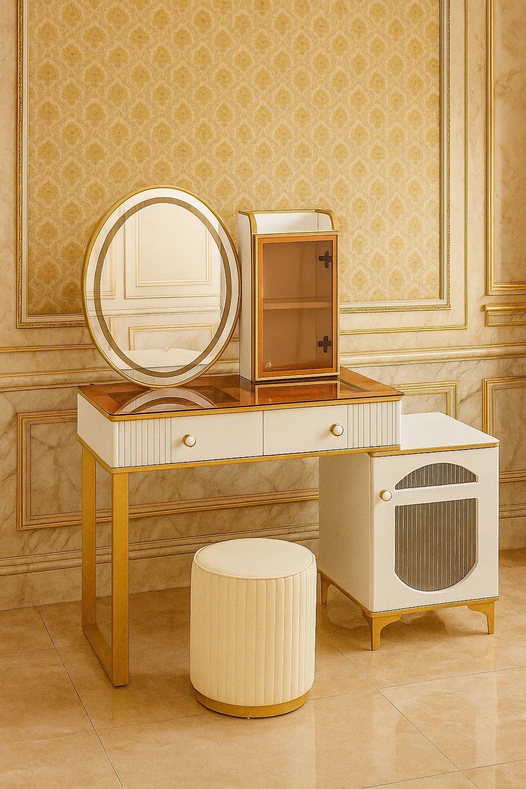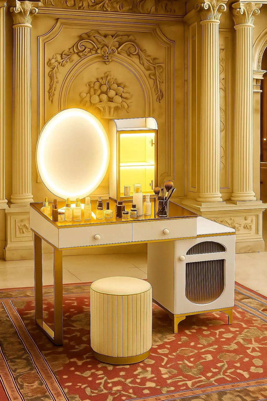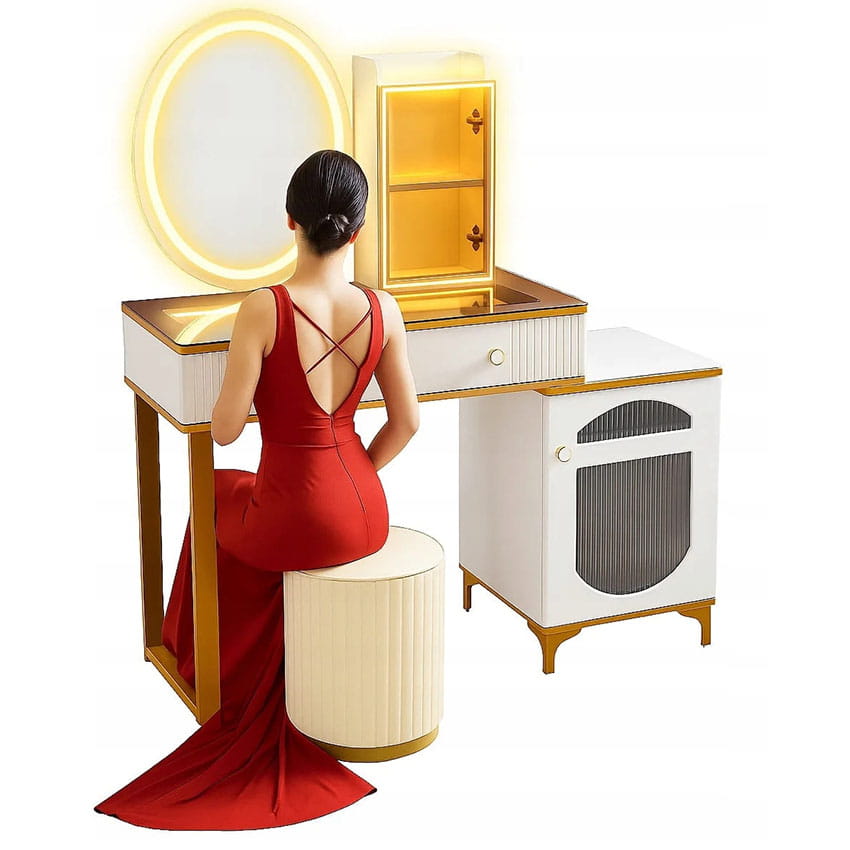 - Skorzystaj z wyjatkowych zalet naszej toaletki. Zestaw zawiera lustro LED i elegancką pufę- wraz z nowoczesnym wzornictwem i dużą przestrzenią do przechowywania kosmetyków do makijażu.