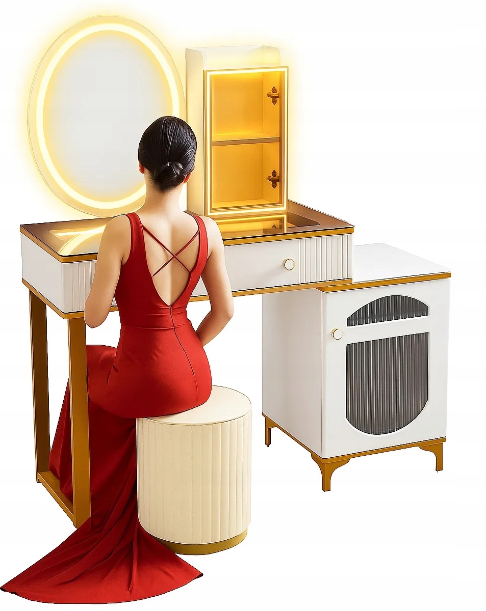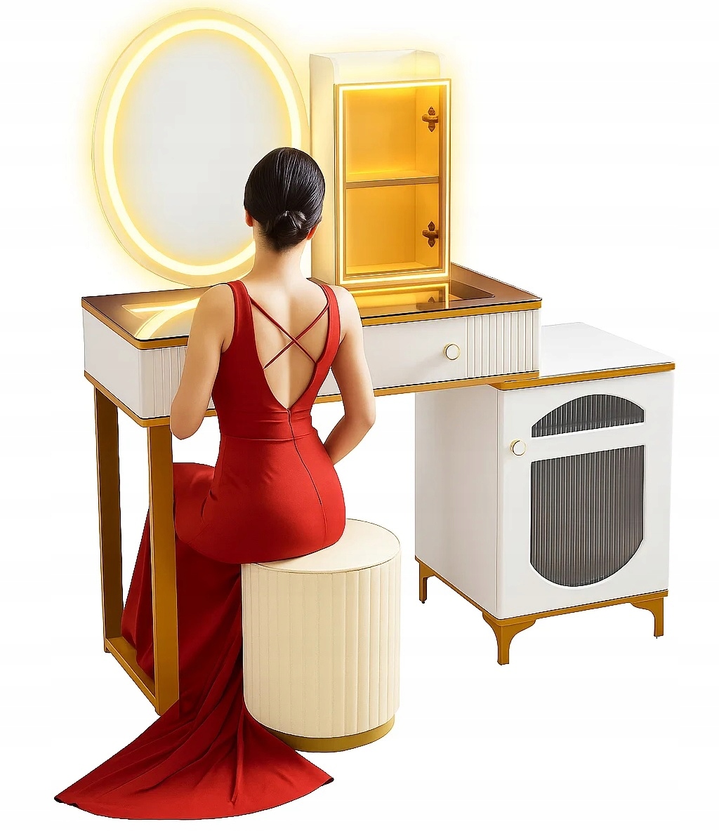 - Zanurz sie w świecie toaletki - stylowej toaletki z lustrem LED, wygodną pufą oraz przestronnymi szufladami..