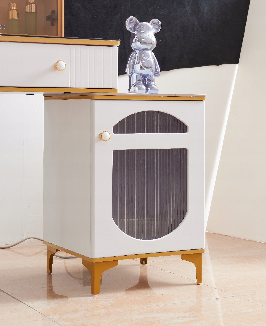 Mebel wykonany jest w eleganckim kolorze, dzięki czemu doskonale wpasuje się w nowoczesne i klasyczne wnętrza. Pojemne szuflady umożliwiają wygodne przechowywanie kosmetyków, akcesoriów i biżuterii, zachowując porządek w przestrzeni.