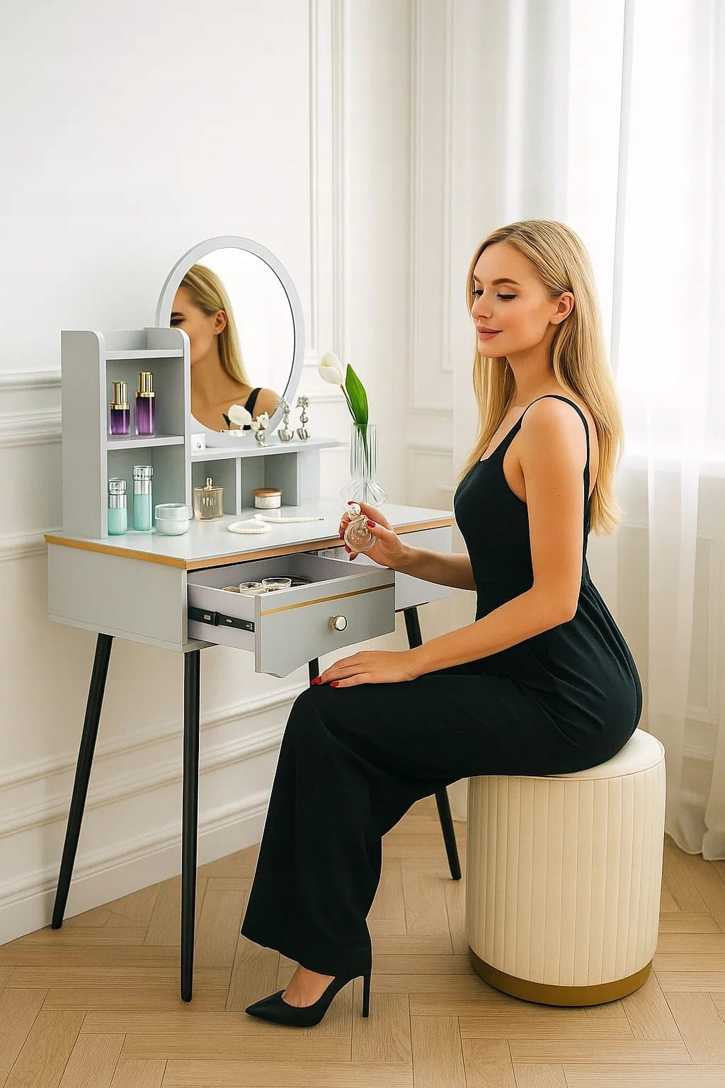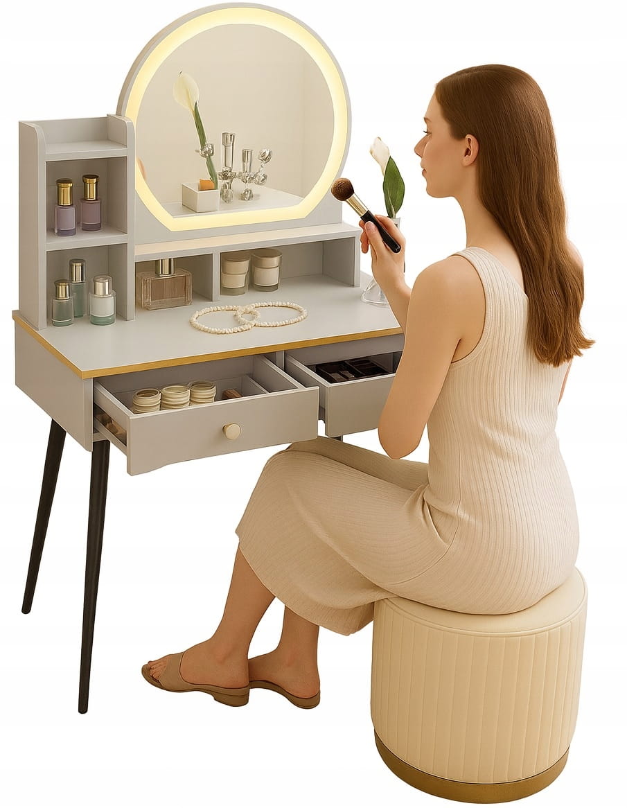 - Zanurz sie w świecie toaletki - stylowej toaletki z lustrem LED, wygodną pufą oraz przestronnymi szufladami..