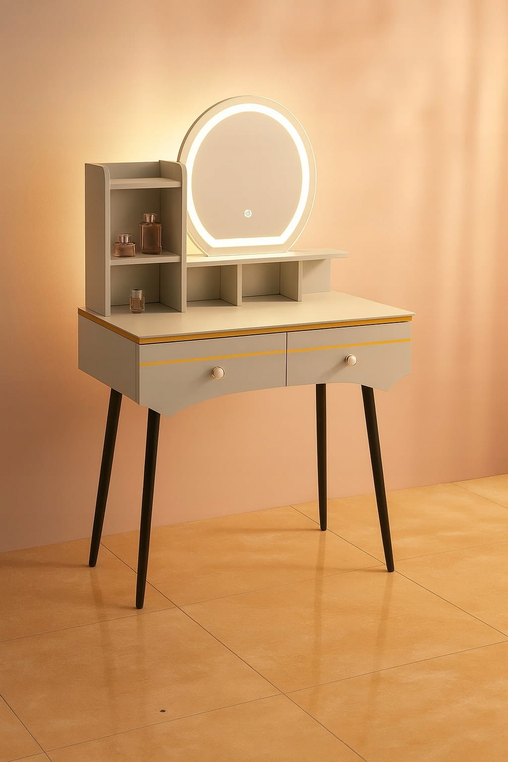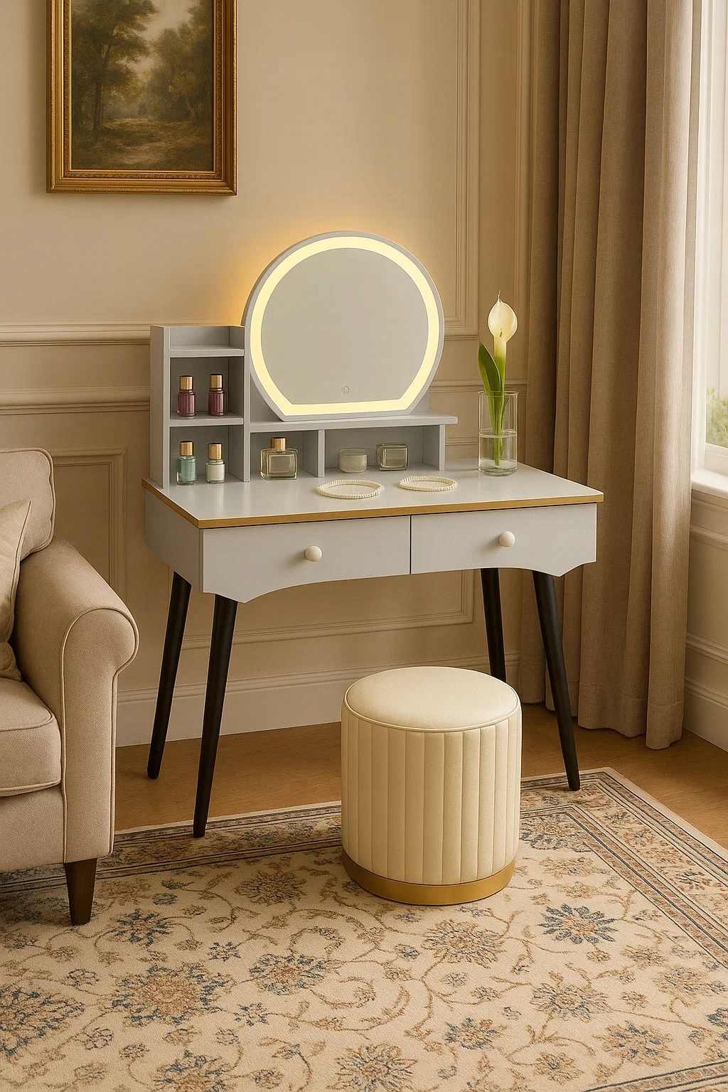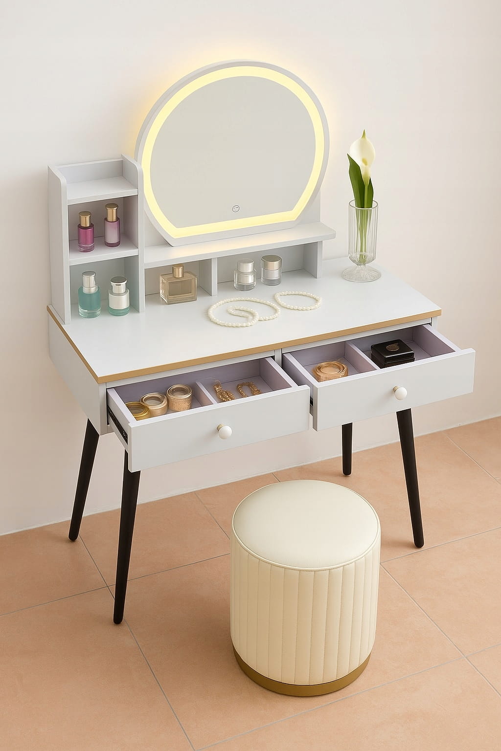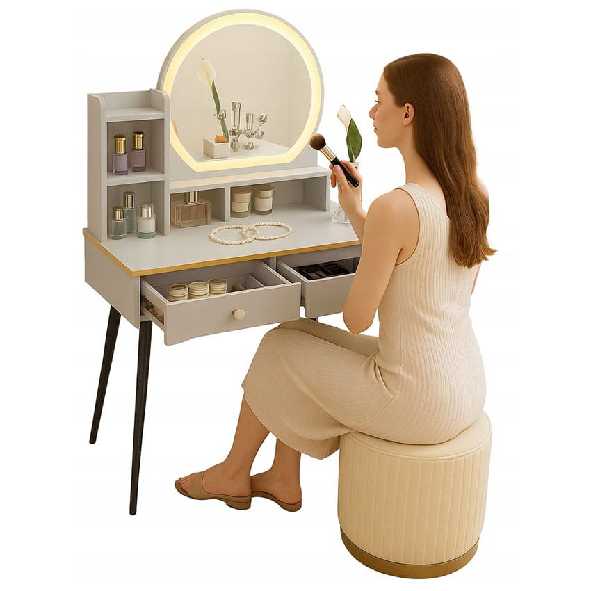 - Skorzystaj z wyjatkowych zalet naszej toaletki. Zestaw zawiera lustro LED i elegancką pufę- wraz z nowoczesnym wzornictwem i dużą przestrzenią do przechowywania kosmetyków do makijażu.