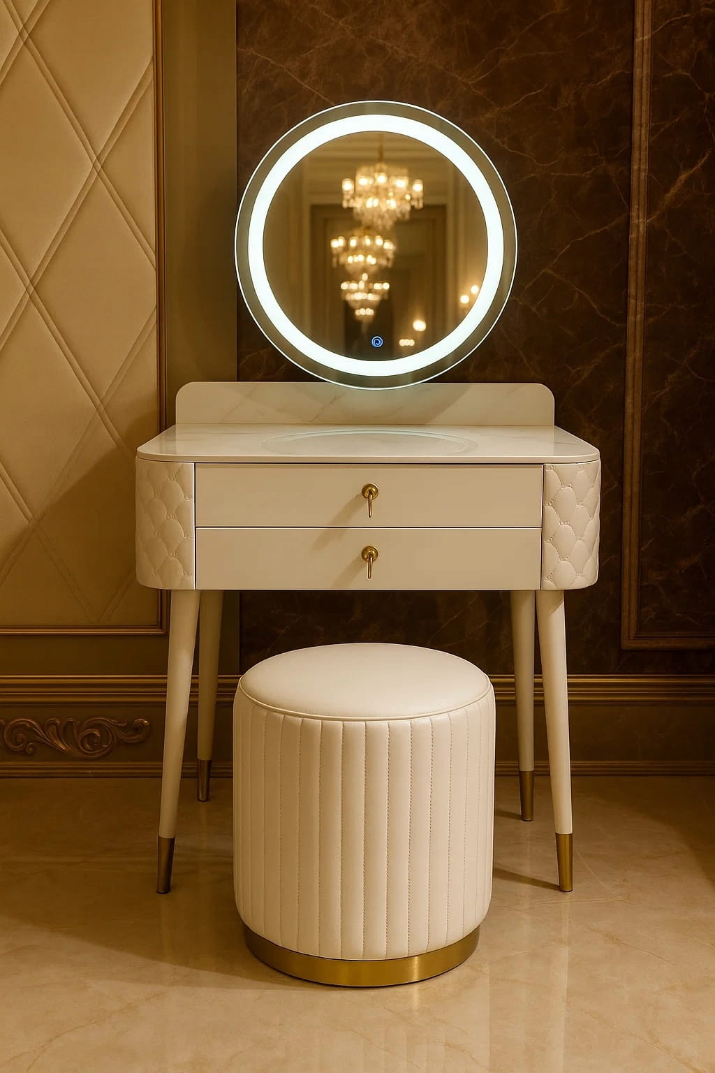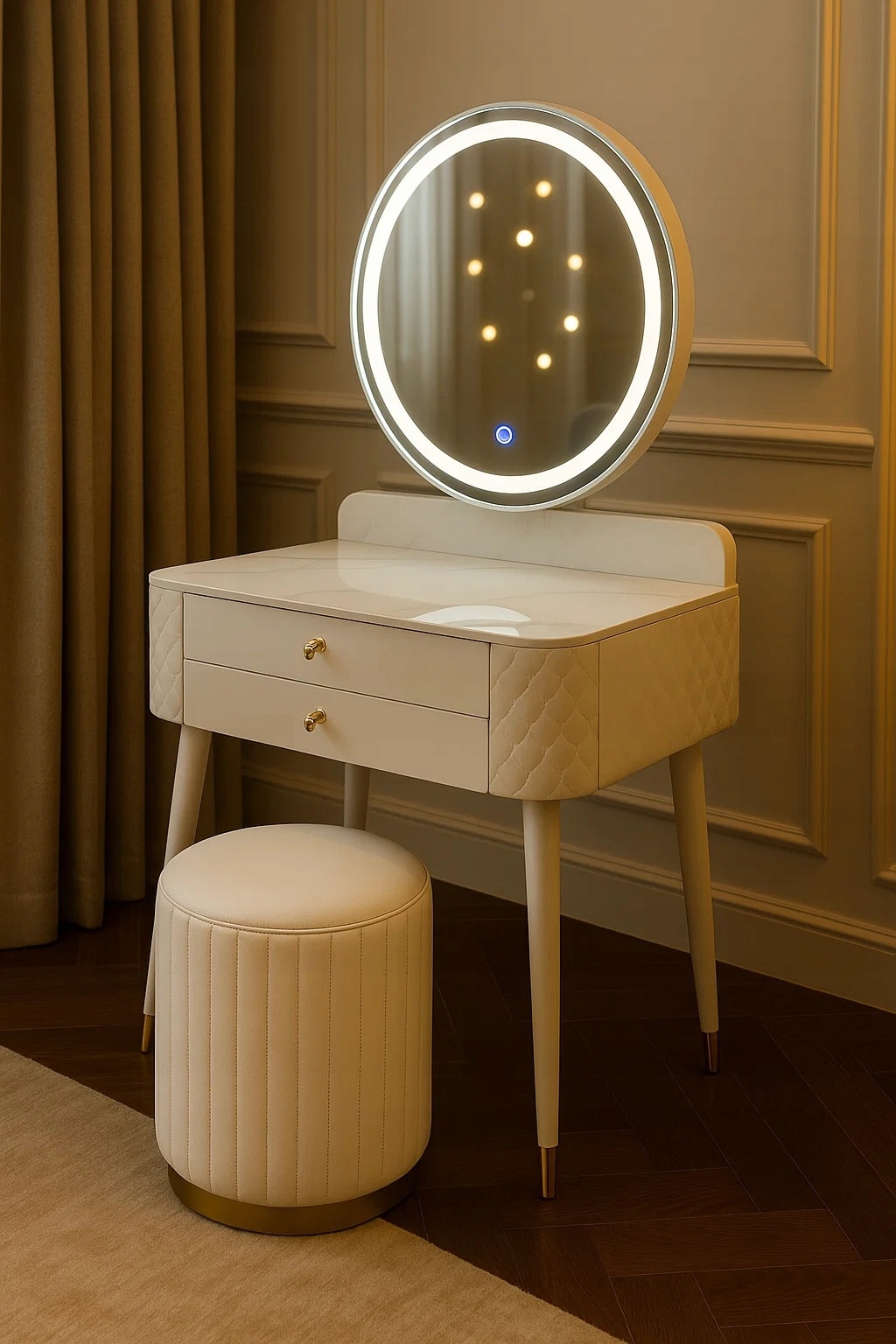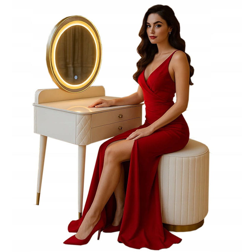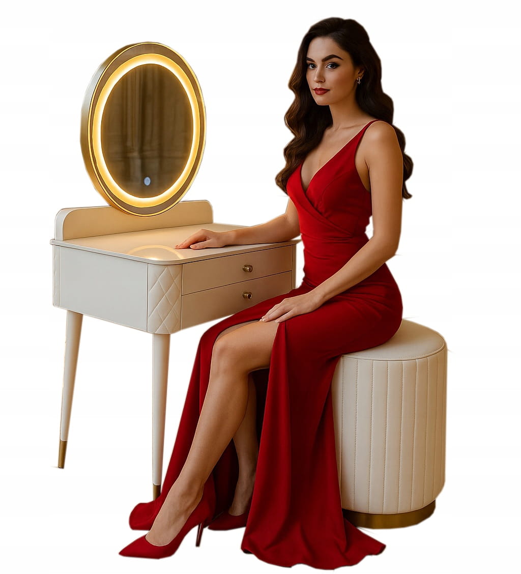 - Skorzystaj z wyjatkowych zalet naszej toaletki. Zestaw zawiera lustro LED i elegancką pufę- wraz z nowoczesnym wzornictwem i dużą przestrzenią do przechowywania kosmetyków do makijażu.