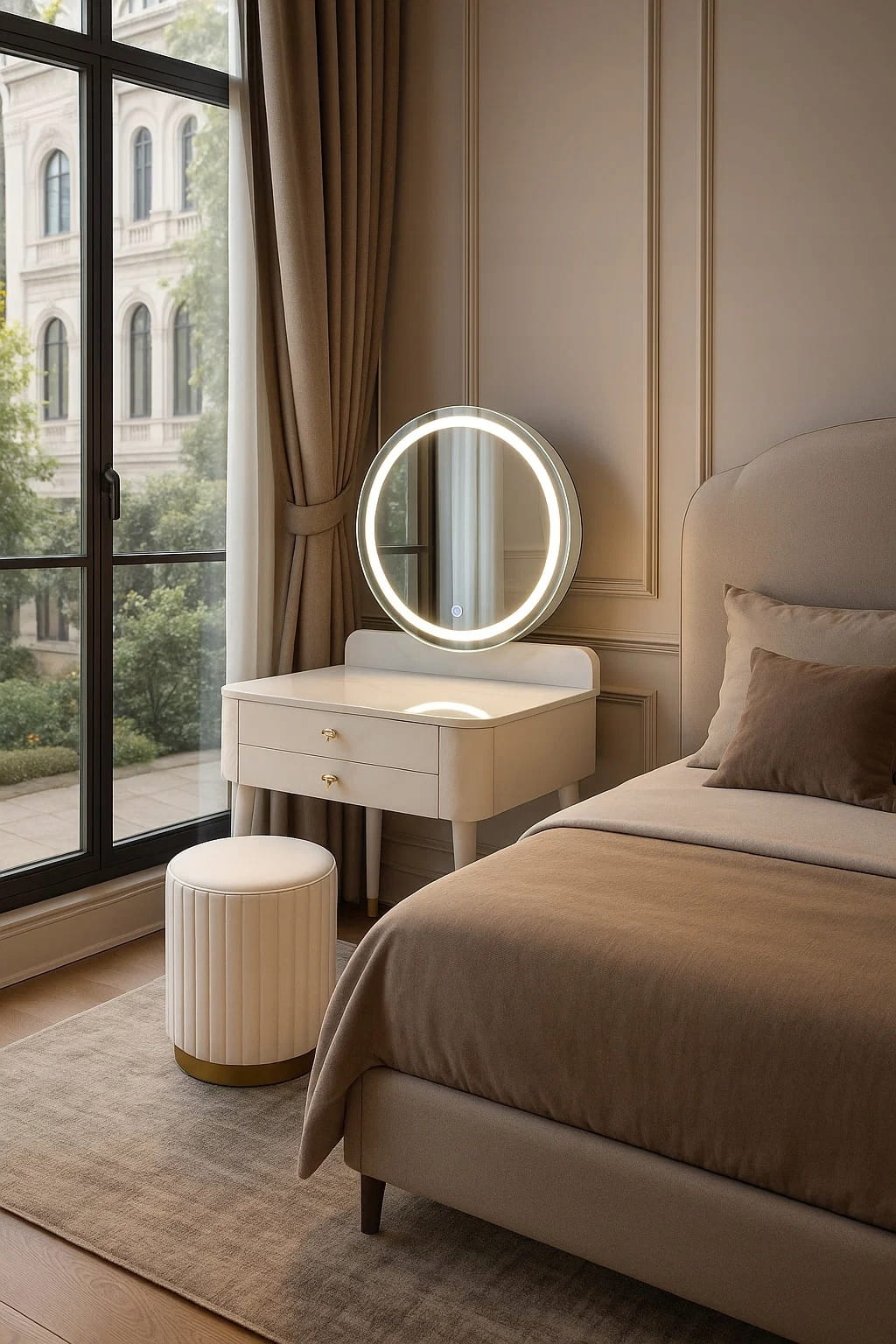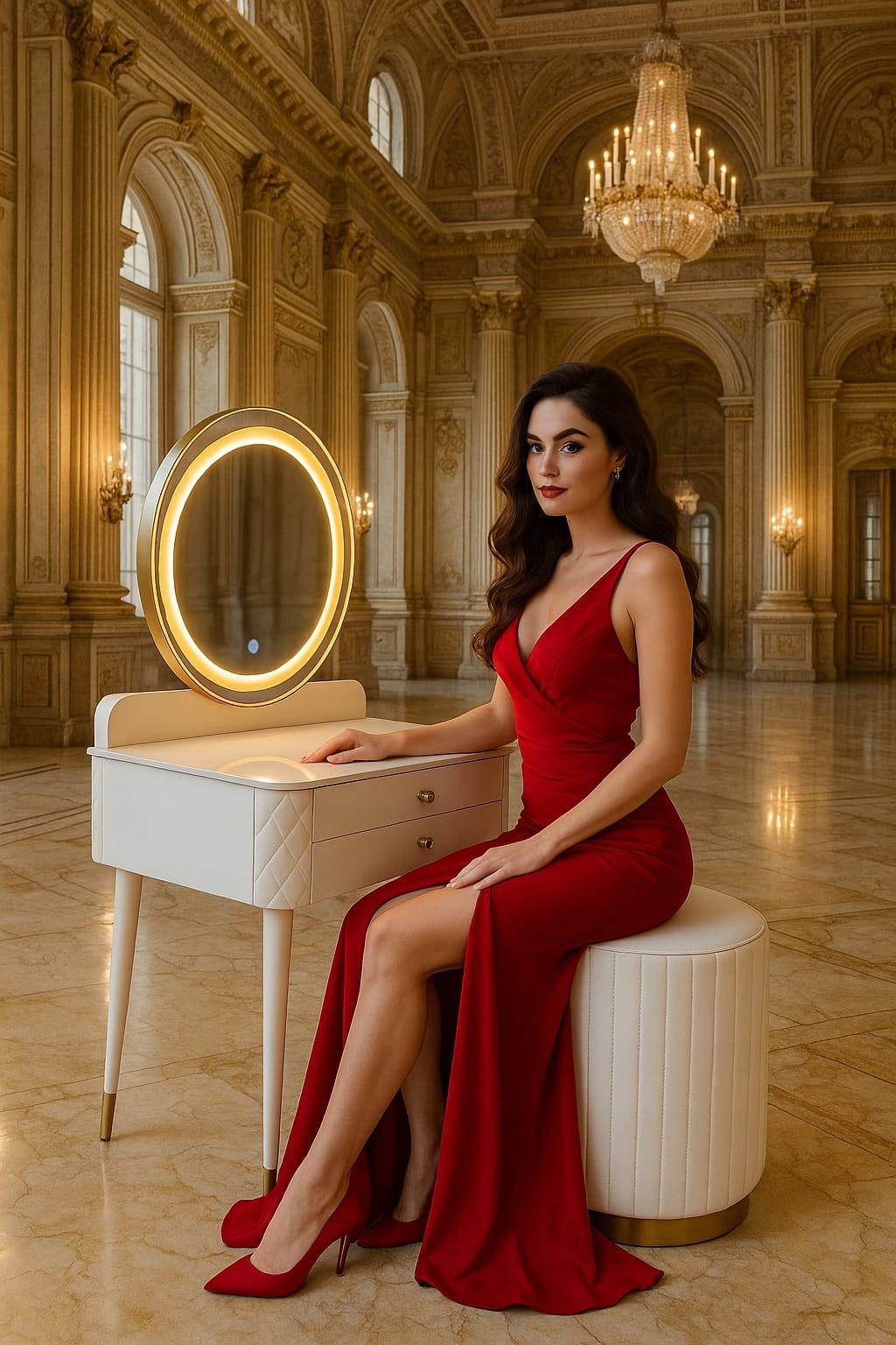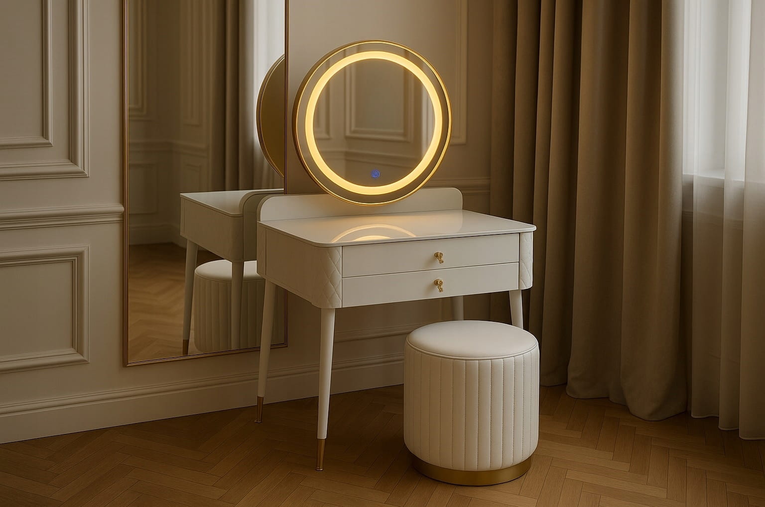 - Skorzystaj z wyjatkowych zalet naszej toaletki. Zestaw zawiera lustro LED i elegancką pufę- wraz z nowoczesnym wzornictwem i dużą przestrzenią do przechowywania kosmetyków do makijażu.