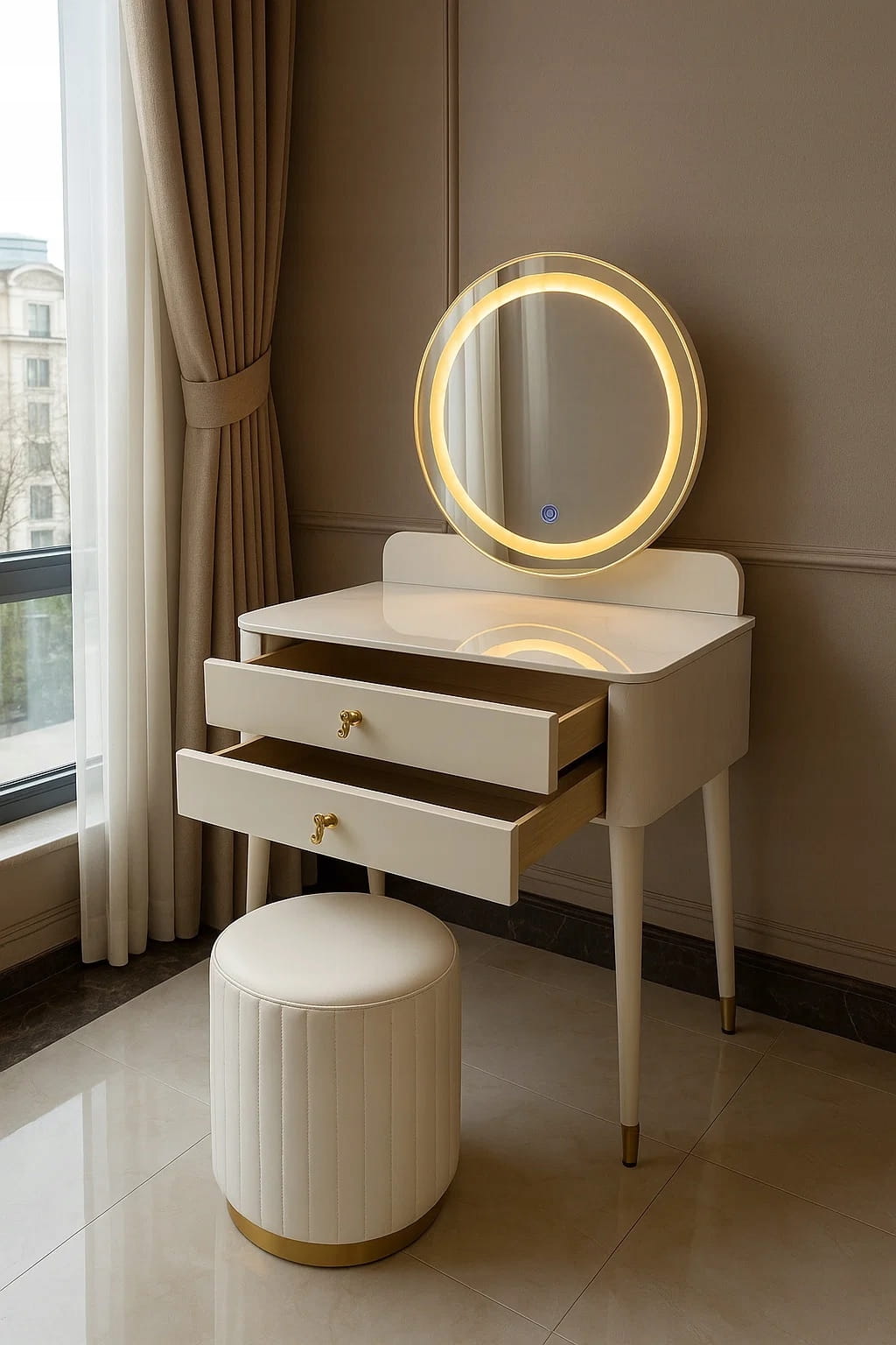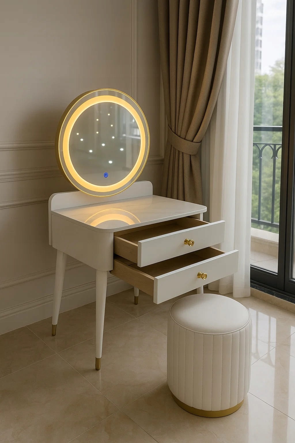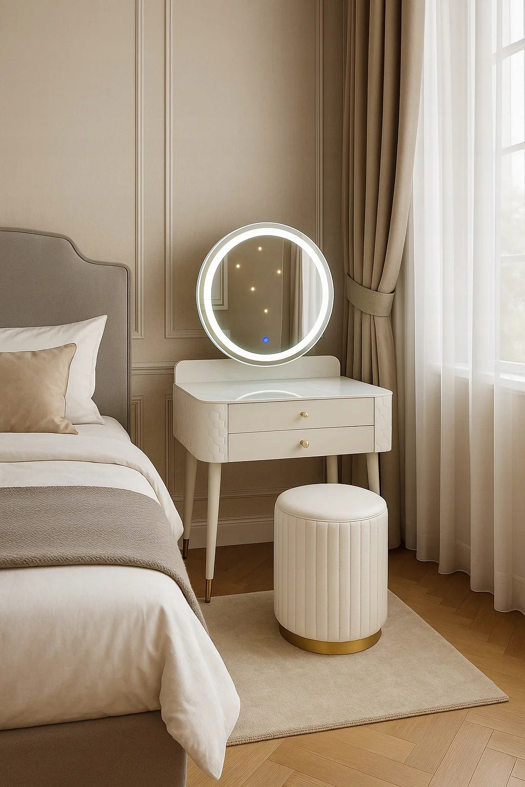 - Zanurz sie w świecie toaletki - stylowej toaletki z lustrem LED, wygodną pufą oraz przestronnymi szufladami..