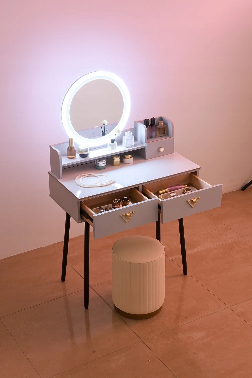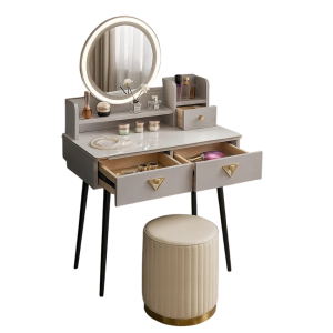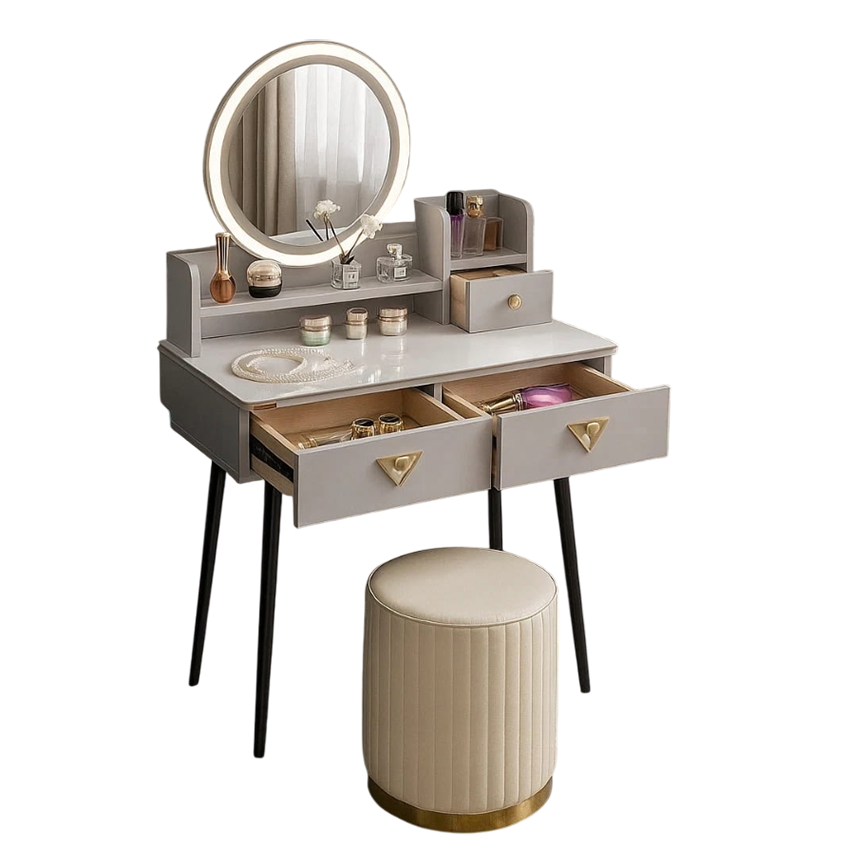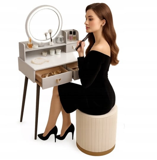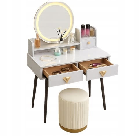 - Skorzystaj z wyjatkowych zalet naszej toaletki. Zestaw zawiera lustro LED i elegancką pufę- wraz z nowoczesnym wzornictwem i dużą przestrzenią do przechowywania kosmetyków do makijażu.