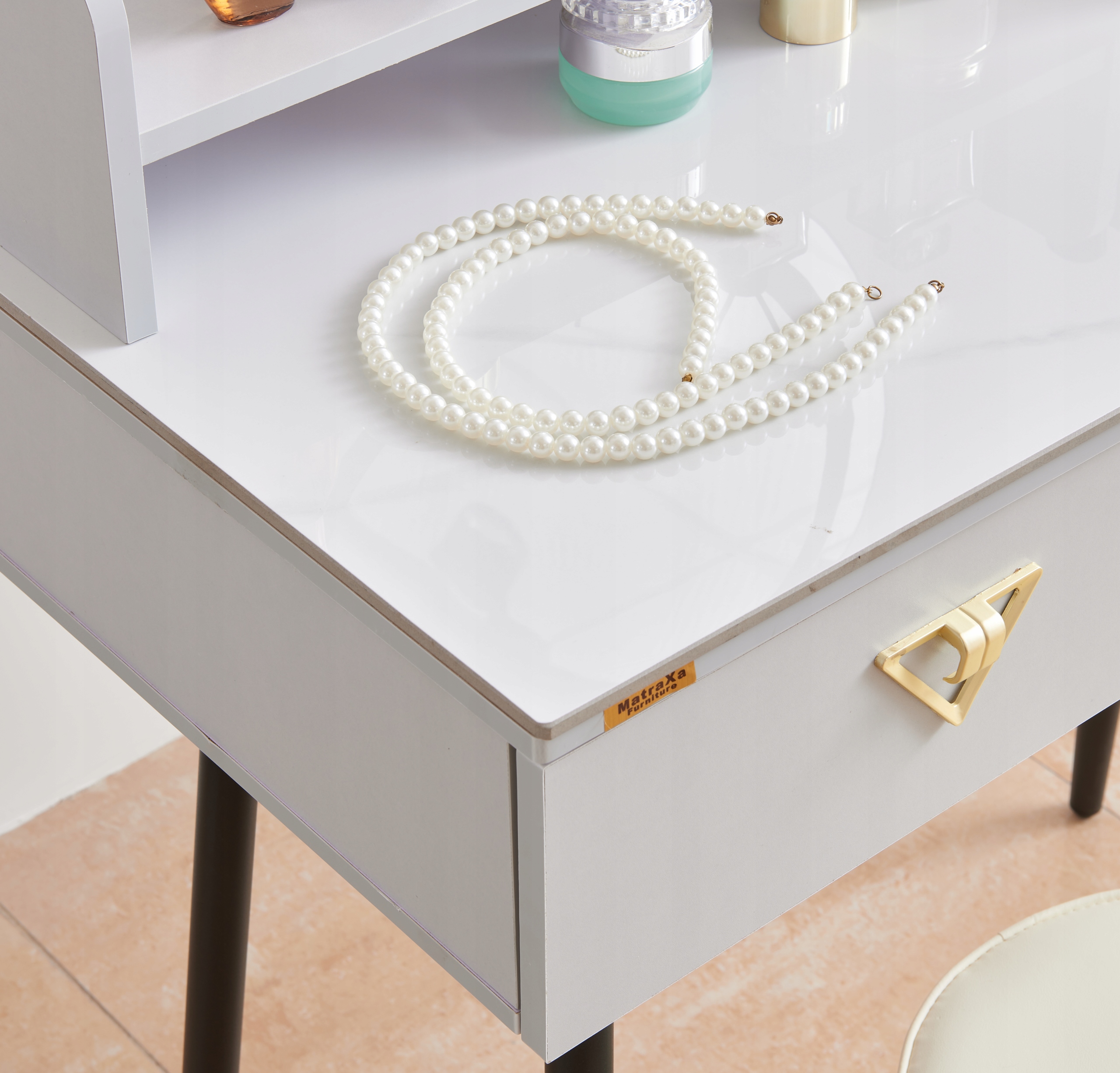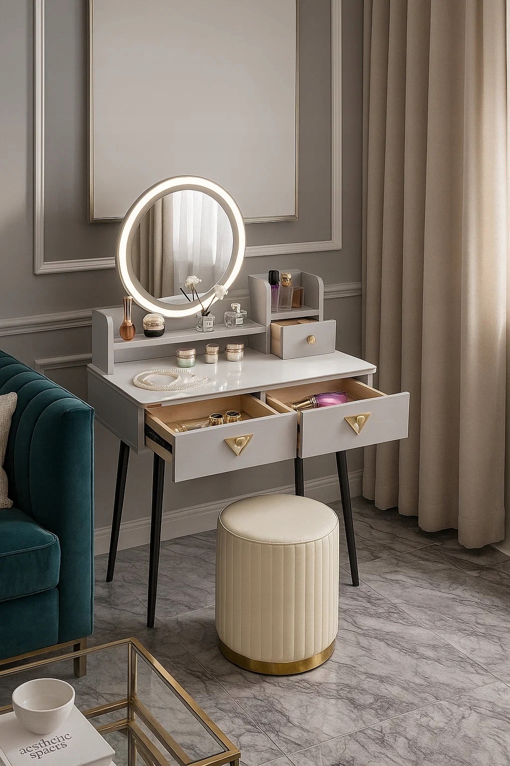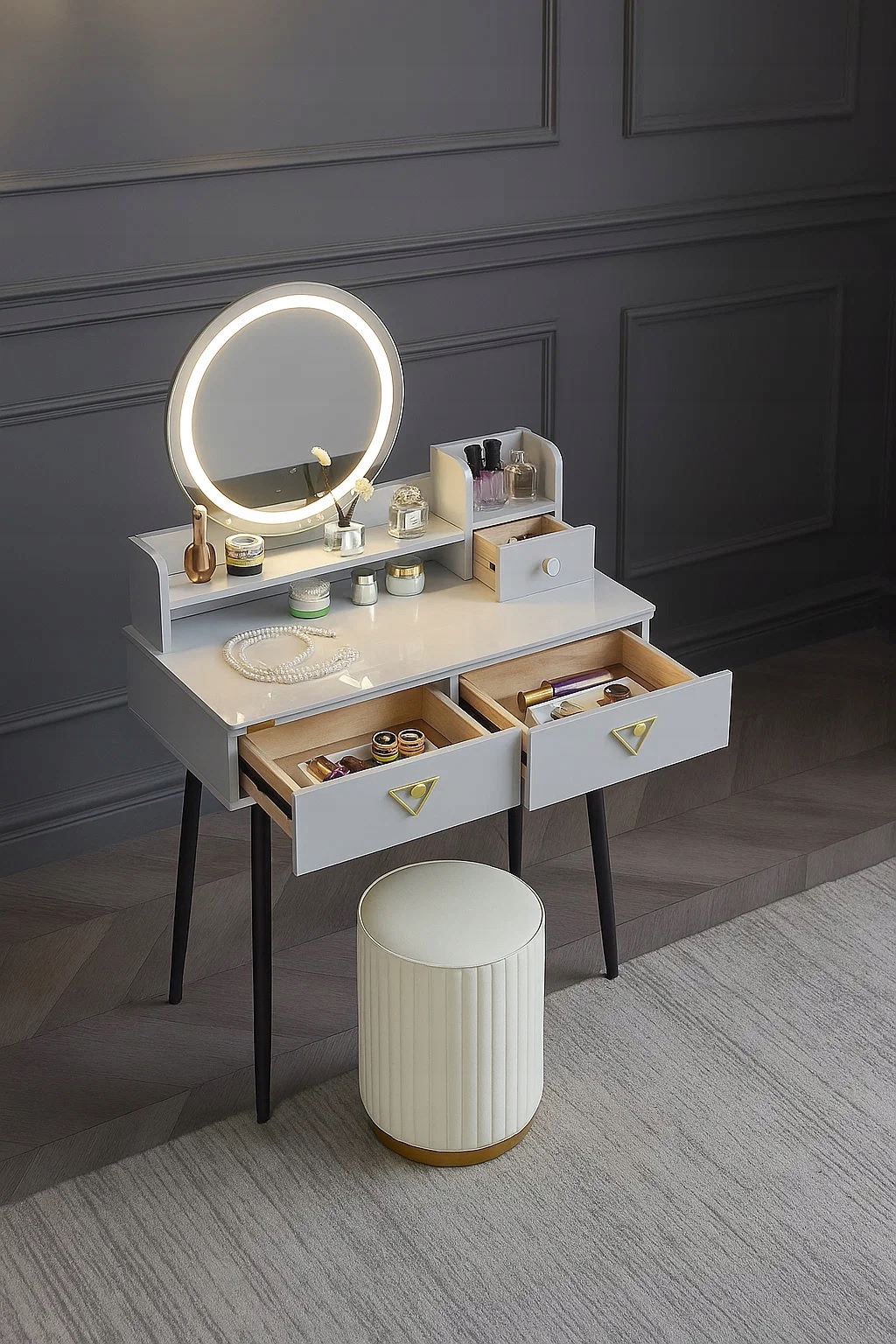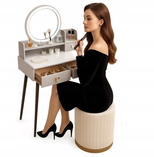 - Zanurz sie w świecie toaletki - stylowej toaletki z lustrem LED, wygodną pufą oraz przestronnymi szufladami..