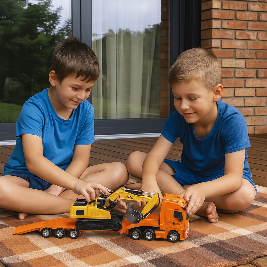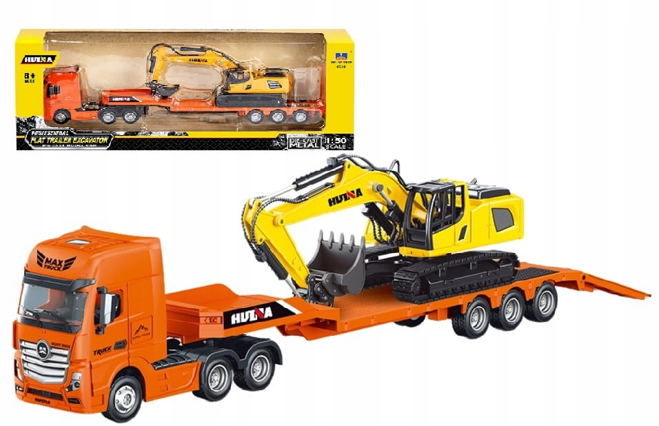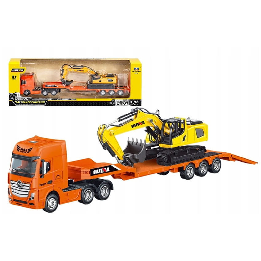 ZESTAW BUDOWLANY Ciężarówka Laweta z Koparką Metal Plastik Skala 1:50