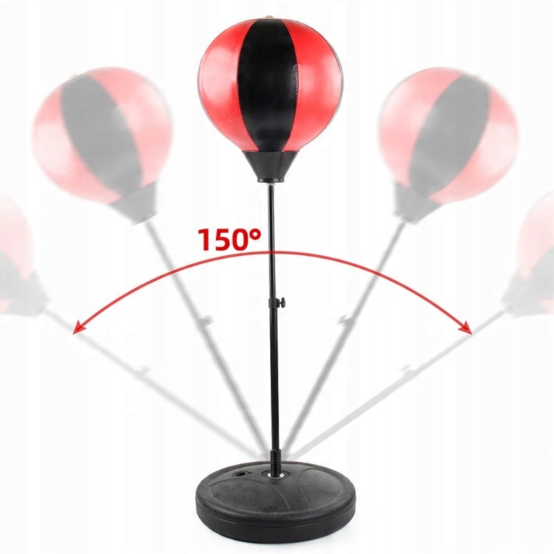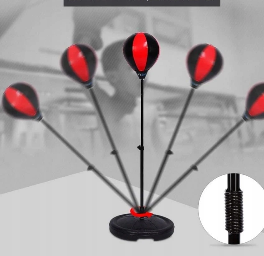 Zestaw treningowy do boksowania składający się z gruszki bokserskiej na sprężynie i rękawic. Gruszka jest umocowana na stalowym wysięgniku.