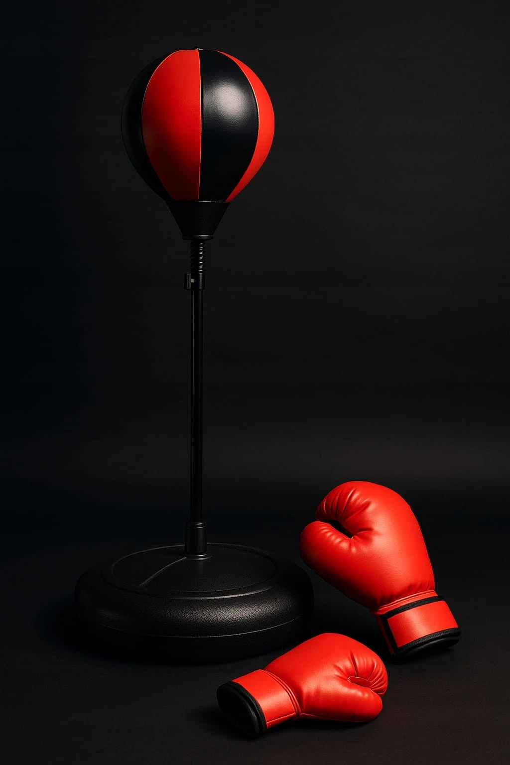 Zestaw treningowy do boksowania składający się z gruszki bokserskiej na sprężynie i rękawic.