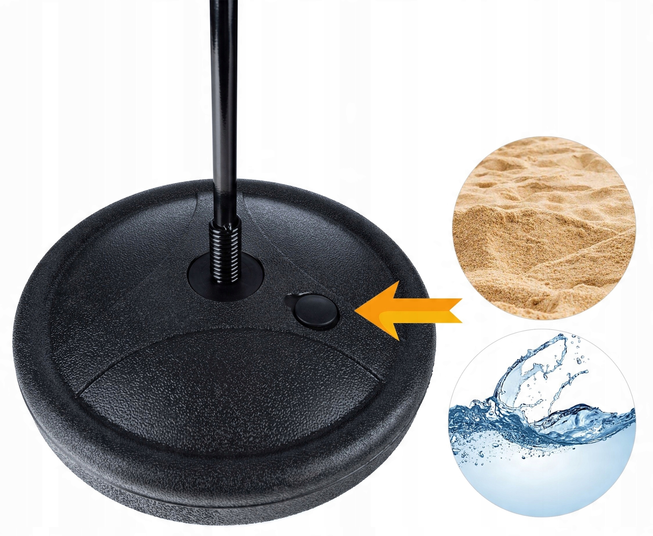 W zestawie znajduje się ponadto komplet śrub, podkładek i elementów potrzebnych do jego montażu. Stabilna podstawa z możliwością obciążenia wodą lub piaskiem.