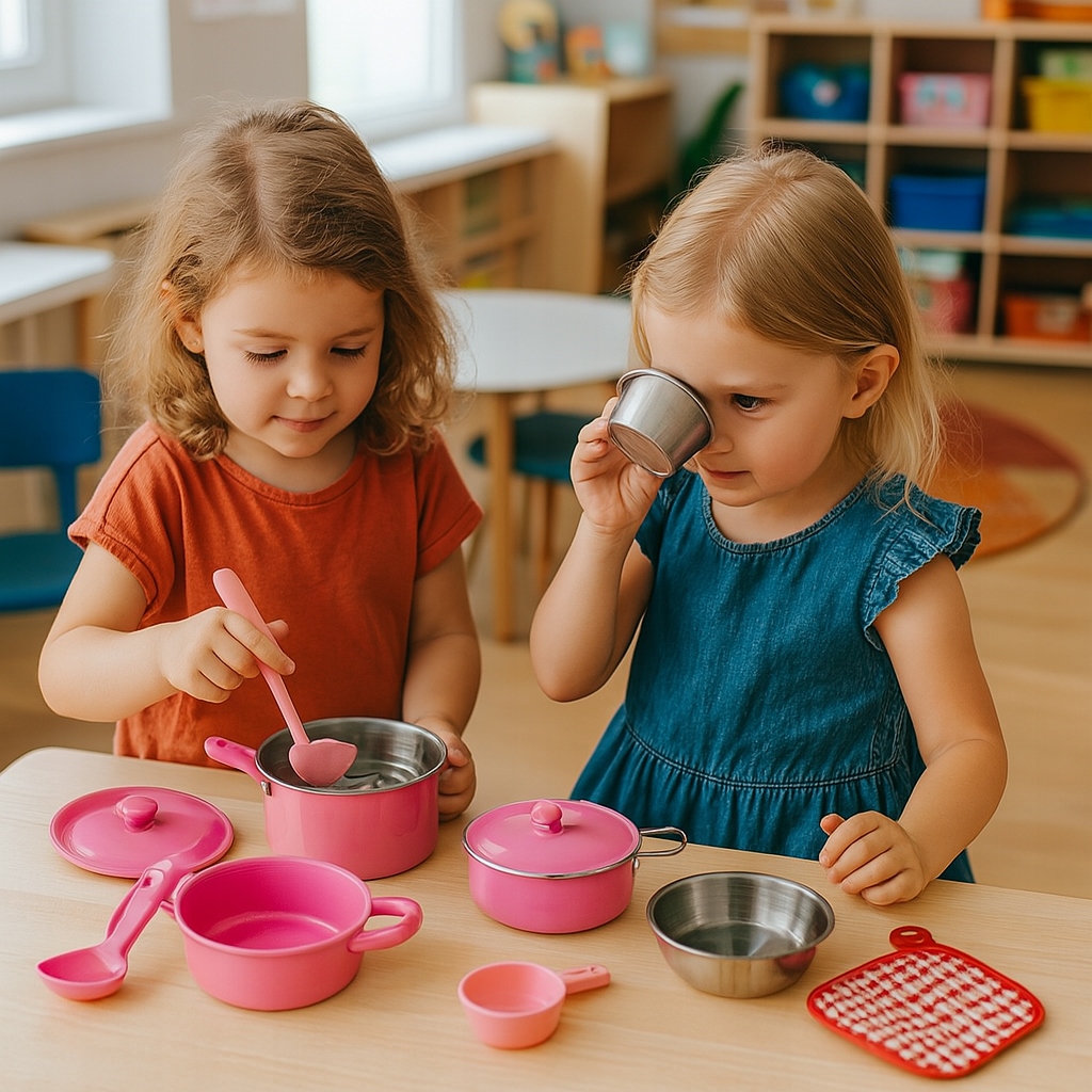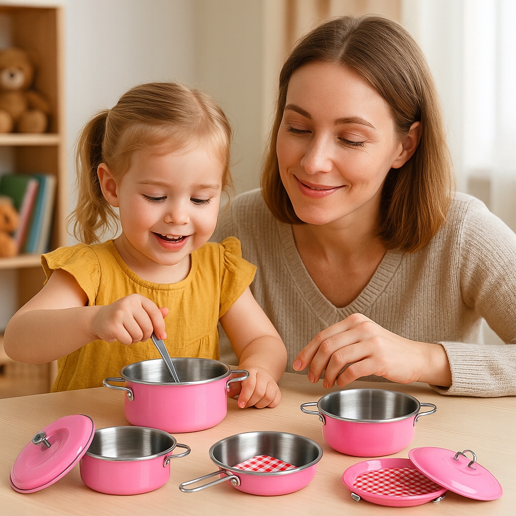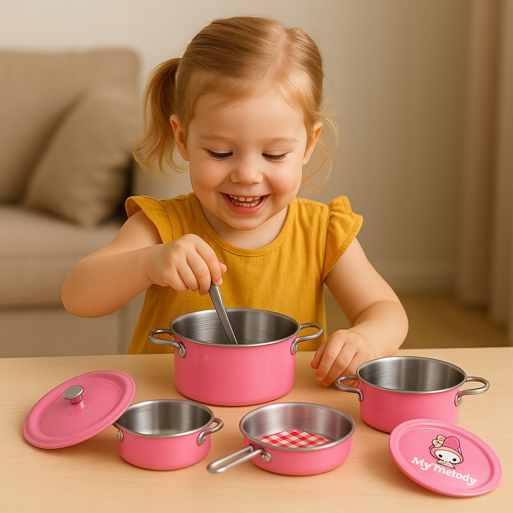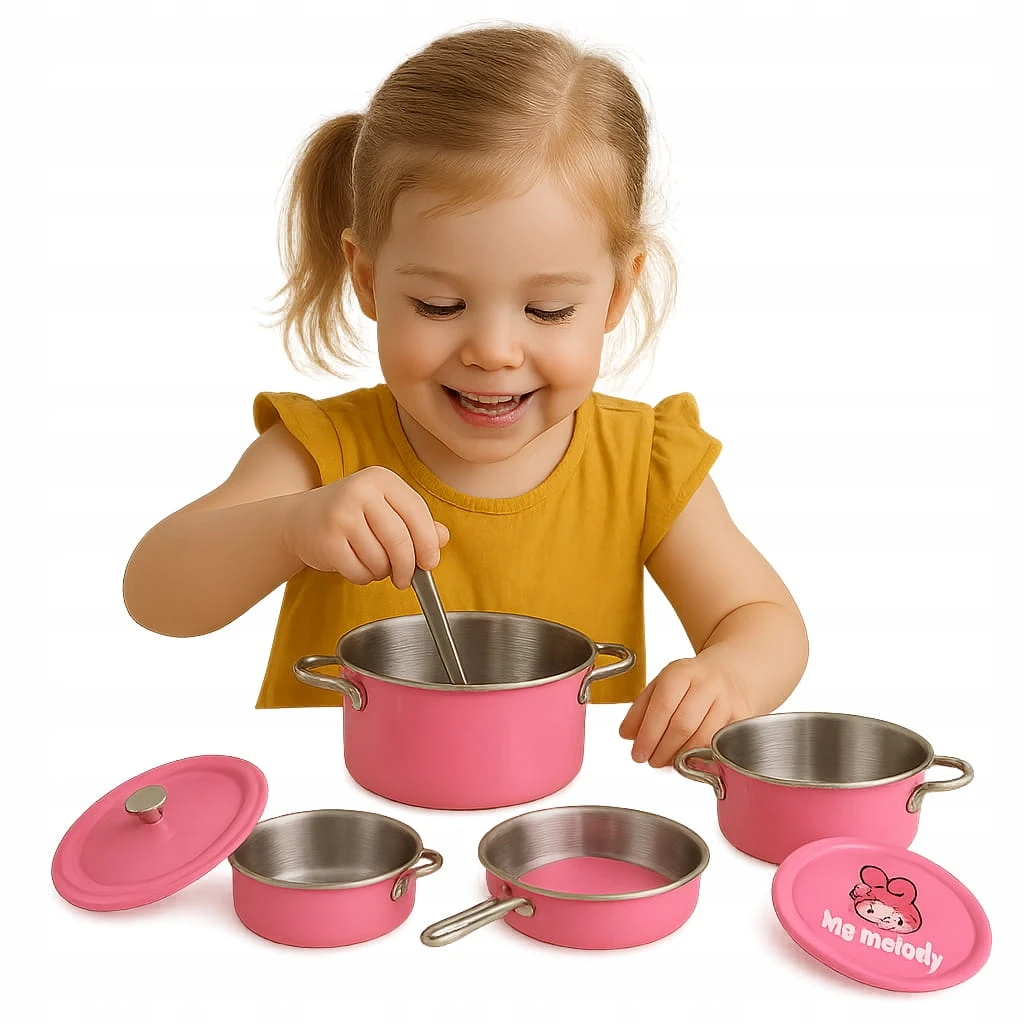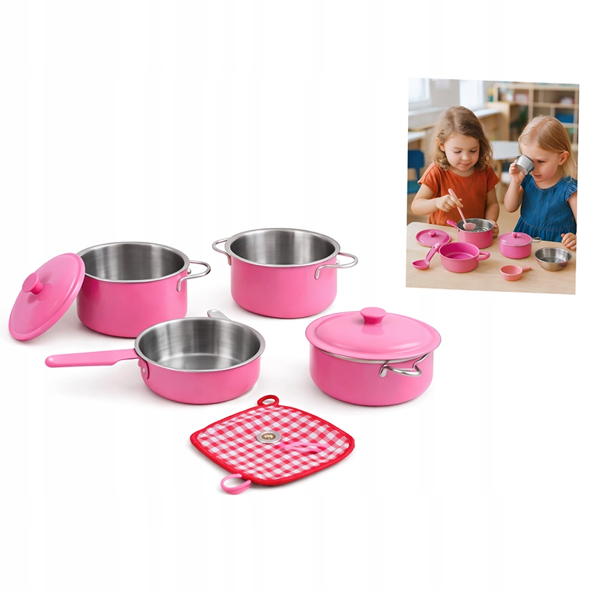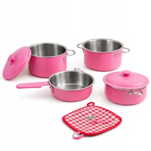 Cały zestaw wykonany jest ze stali nierdzewnej i genialnie imituje prawdziwe garnki kuchenne. Doskonała i długa rozrywka, która łączy zabawę z nauką. Dokładne repliki codziennych przyborów kuchennych, ale w mniejszym rozmiarze z myślą o dzieciach.