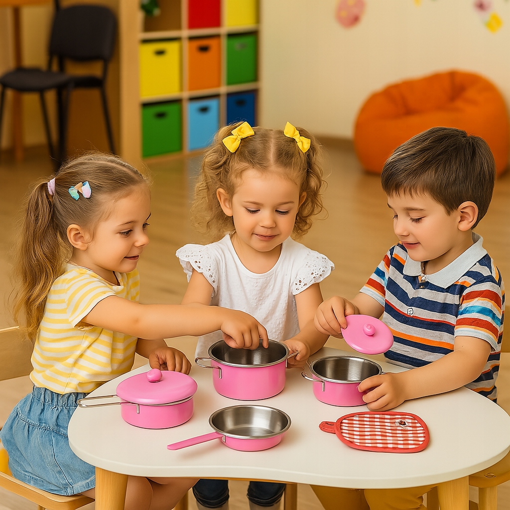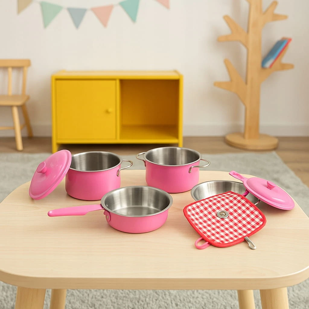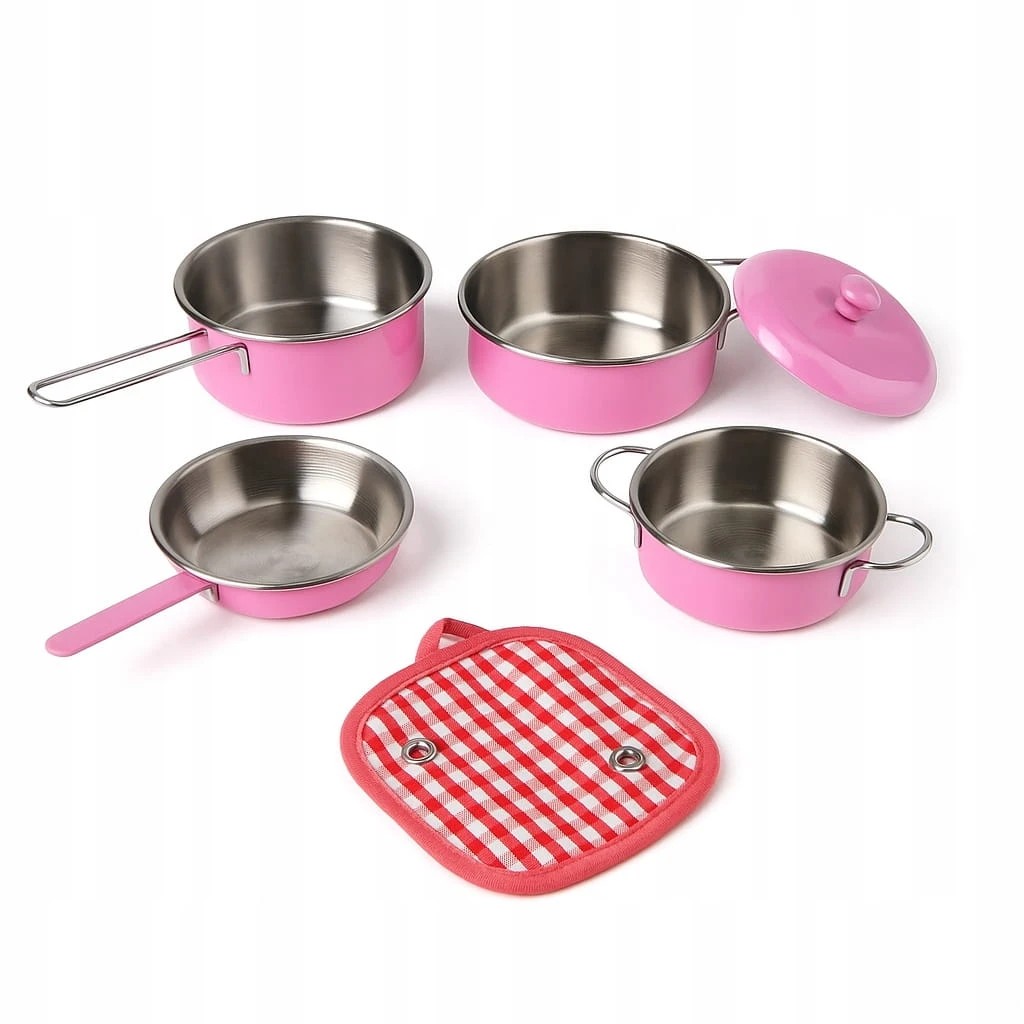 Metalowy zestaw kuchenny dla dzieci - akcesoria kuchenne dla dzieci oraz metalowe garnki o różnej wielkości.