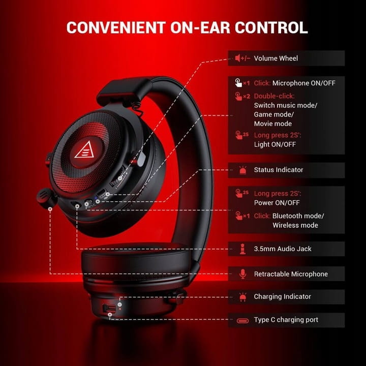 - Całkowicie metalowa konstrukcja: Te słuchawki mają metalową konstrukcję i dobrą stabilność strukturalną z diodami LED dla futurystycznego, hi-tech wyglądu. Na nausznikach umieszczone są światła LED (działają tylko z kablem USB), które podkreślają atmosferę gry.